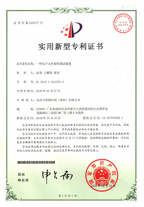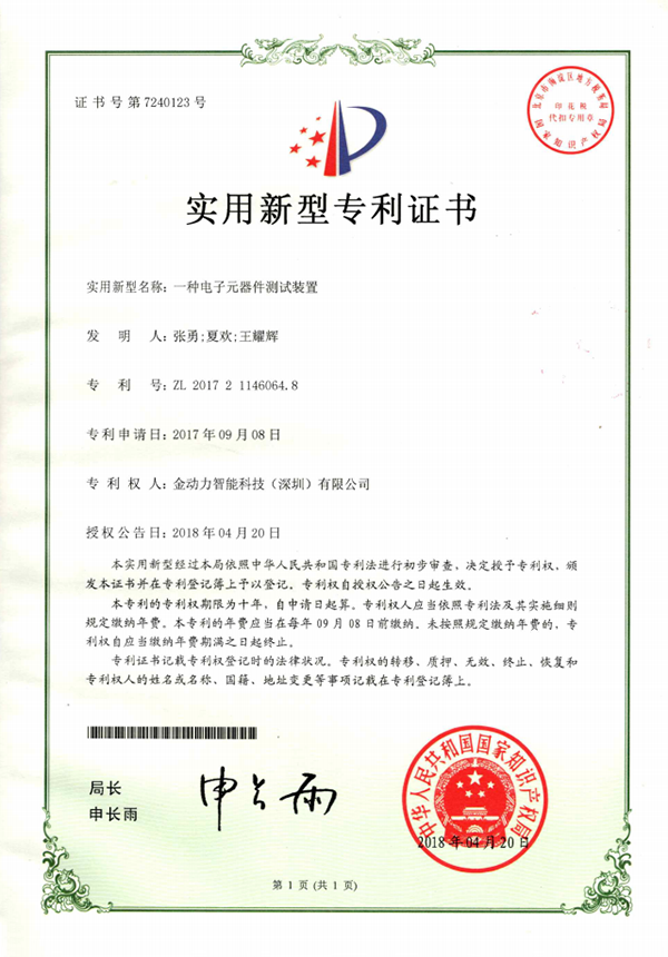 01一(yī)種電(diàn)子(zǐ)元器(qì)件(jiàn)測試裝置專利證書(shū)