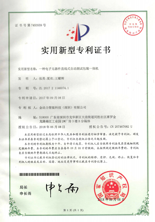 11一(yī)種電(diàn)子(zǐ)元器(qì)件(jiàn)直線式自(zì)動測試裝包裝一(yī)體(tǐ)機(jī)專利證書(shū)