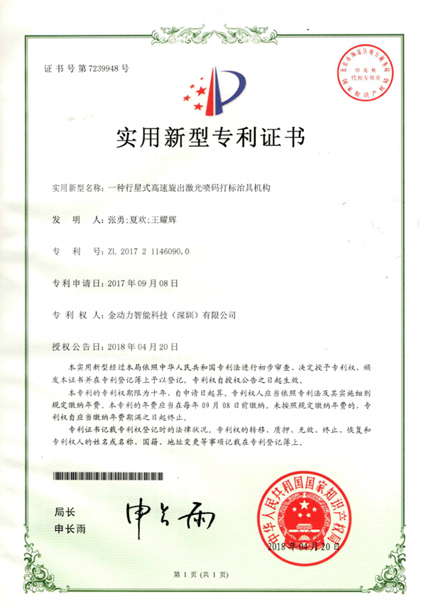 03一(yī)種行(xíng)星式高(gāo)速旋出激光(guāng)噴碼打标治具機(jī)構專利證書(shū)